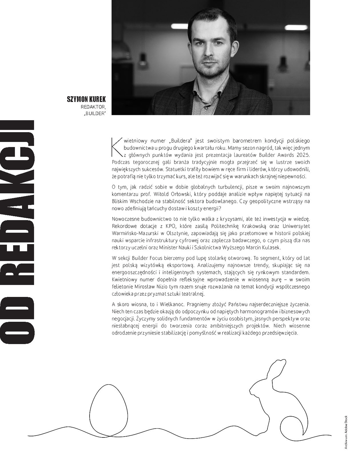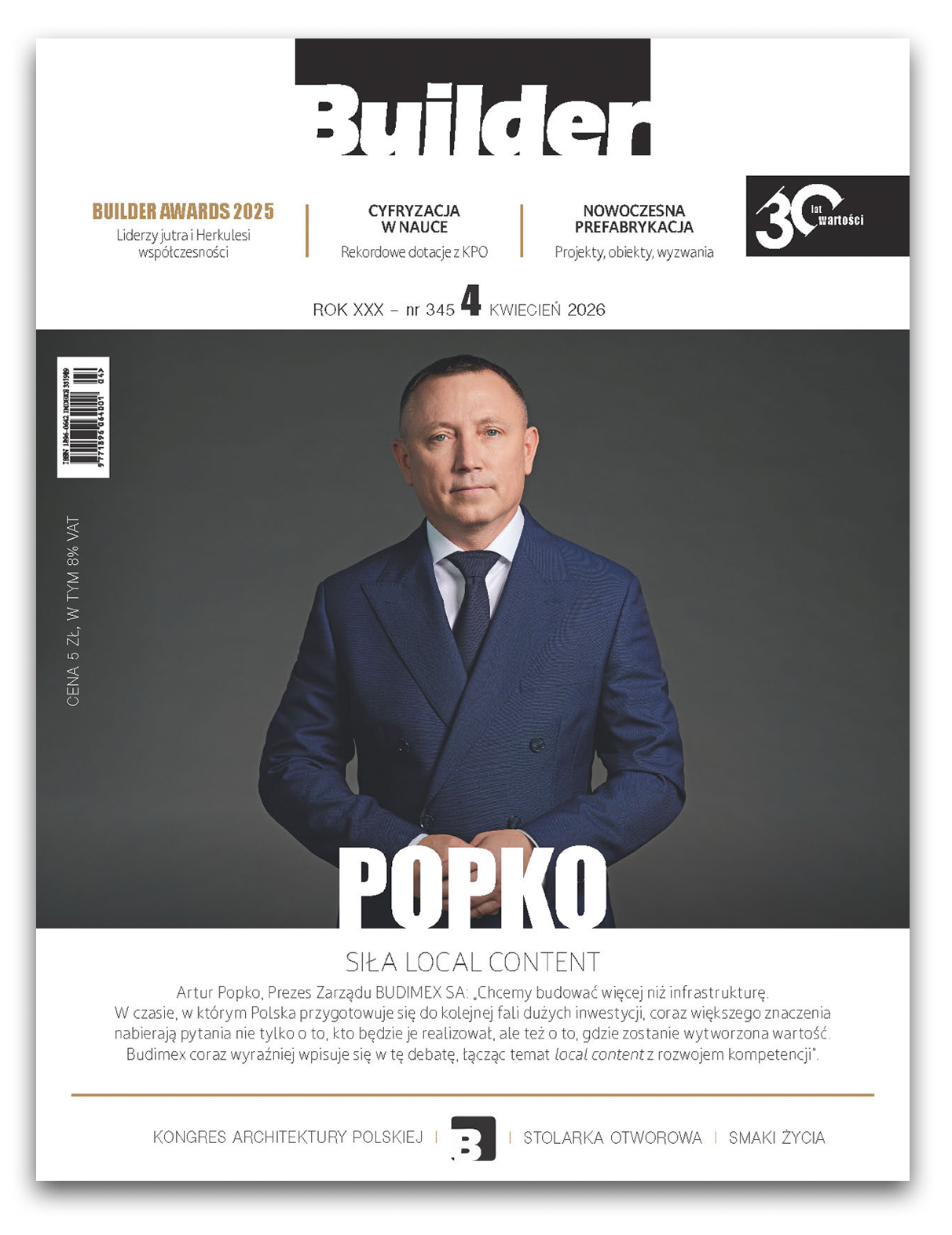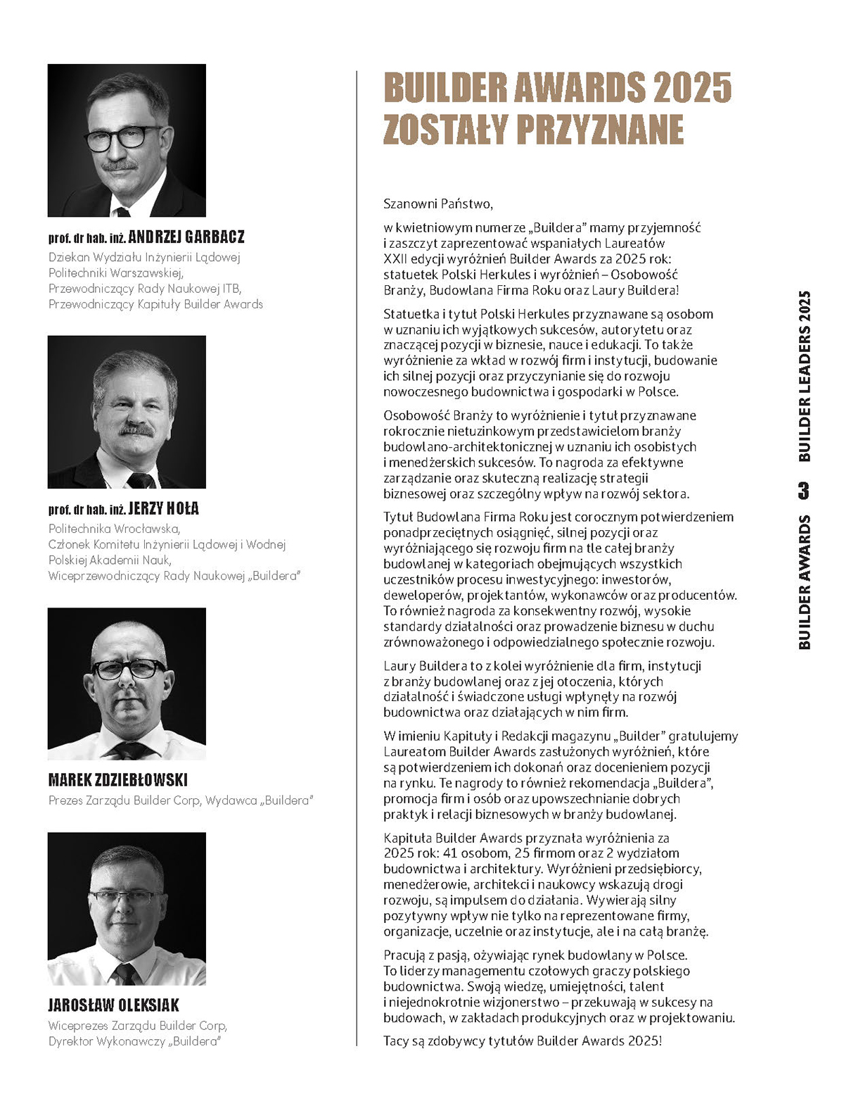 Kwietniowy numer „Buildera” jest swoistym barometrem kondycji polskiego budownictwa u progu drugiego kwartału roku. Mamy sezon nagród, tak więc jednym z głównych punktów wydania jest prezentacja laureatów Builder Awards 2025. Podczas tegorocznej gali branża tradycyjnie mogła przejrzeć się w lustrze swoich największych sukcesów. Statuetki trafiły bowiem w ręce firm i liderów, którzy udowodnili, że potrafią nie tylko trzymać kurs, ale też rozwijać się w warunkach skrajnej niepewności.
