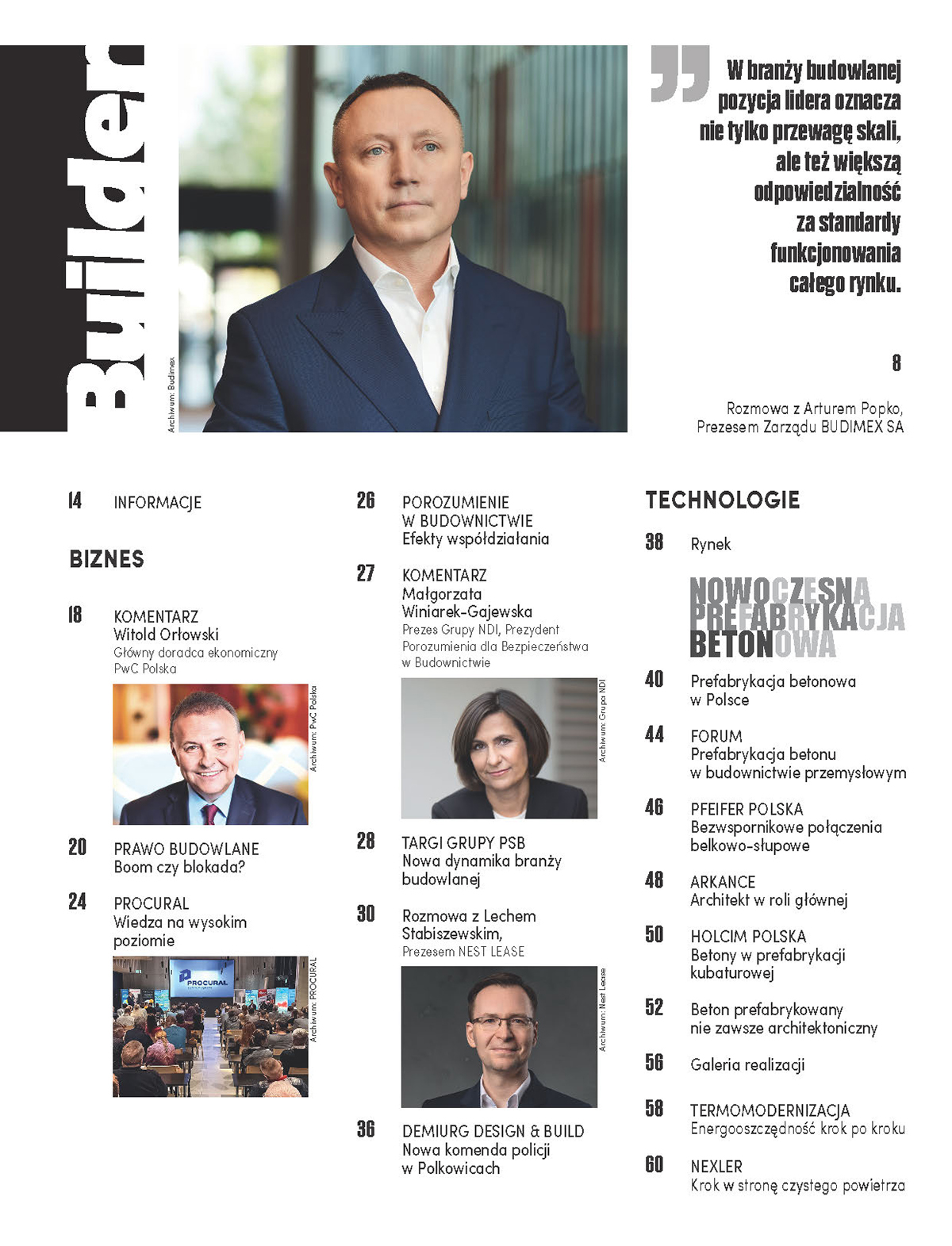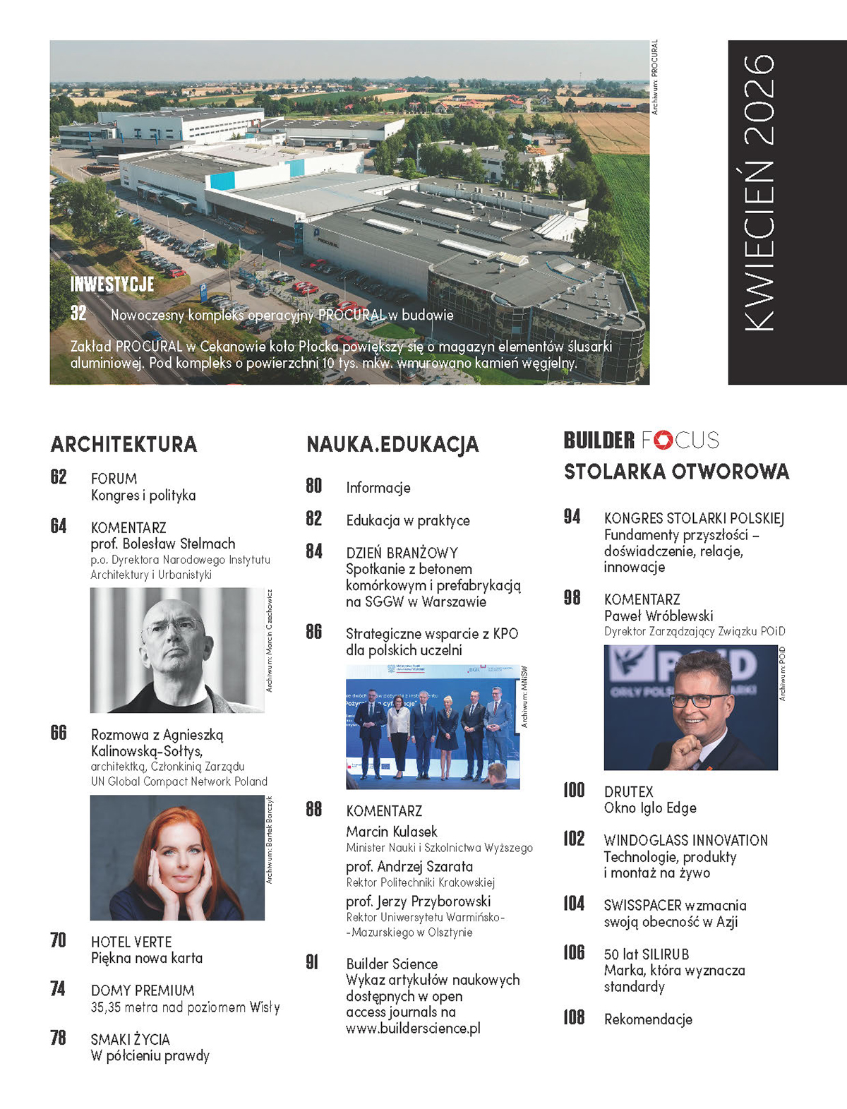 W sekcji Builder Focus bierzemy pod lupę stolarkę otworową. To segment, który od lat jest polską wizytówką eksportową. Analizujemy najnowsze trendy, skupiając się na energooszczędności i inteligentnych systemach, stających się rynkowym standardem. Kwietniowy numer dopełnia refleksyjne wprowadzenie w wiosenną aurę – w swoim felietonie Mirosław Nizio tym razem snuje rozważania na temat kondycji współczesnego człowieka przez pryzmat sztuki teatralnej.