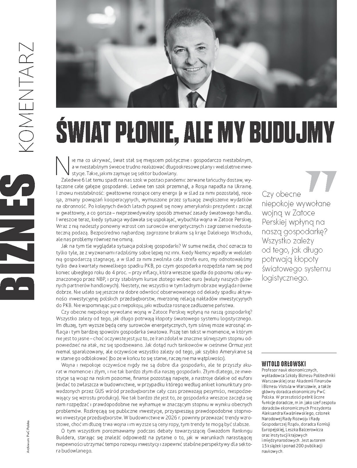 O tym, jak radzić sobie w dobie globalnych turbulencji, pisze w swoim najnowszym komentarzu prof. Witold Orłowski, który poddaje analizie wpływ napiętej sytuacji na Bliskim Wschodzie na stabilność sektora budowlanego. Czy geopolityczne wstrząsy na nowo zdefiniują łańcuchy dostaw i koszty energii?